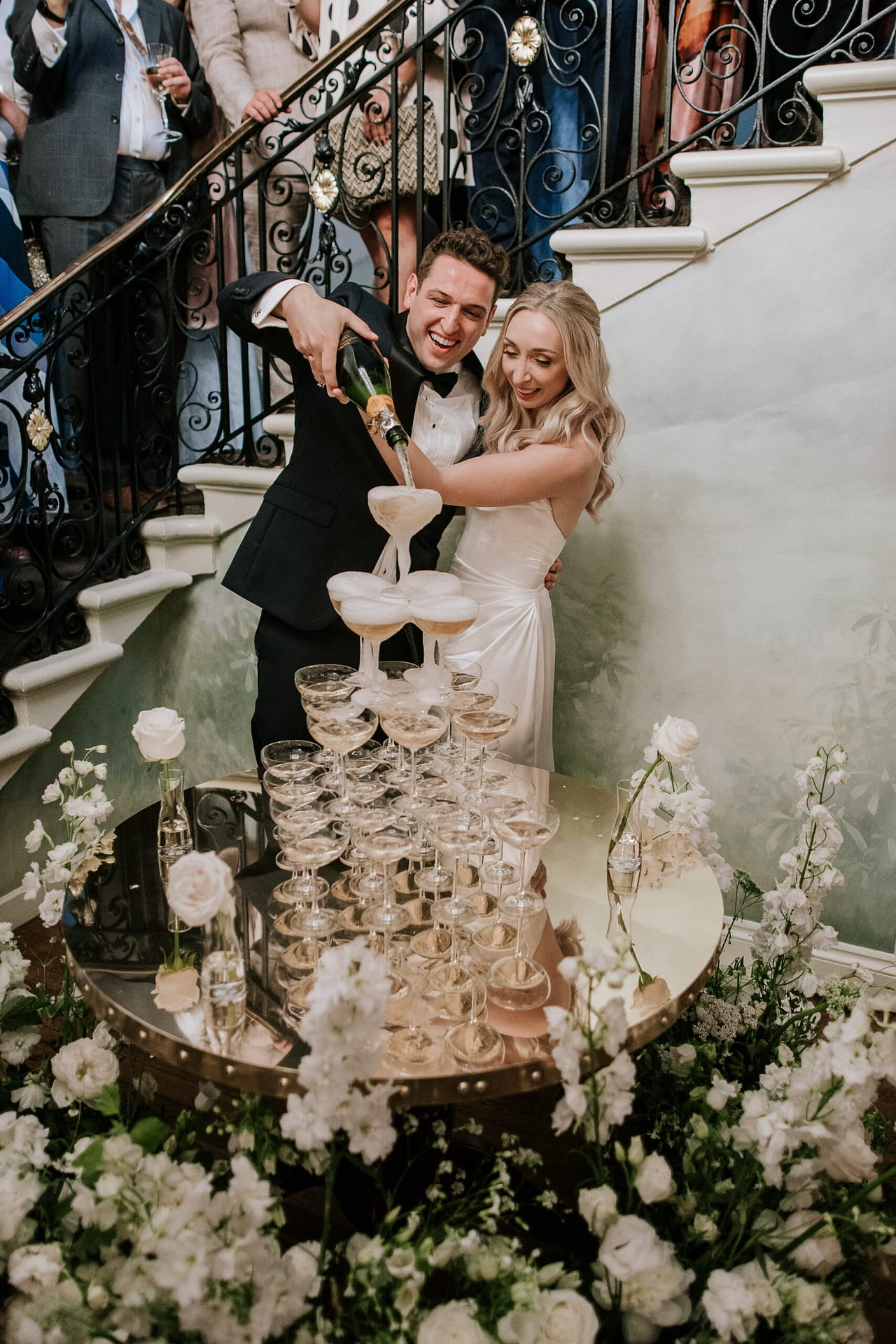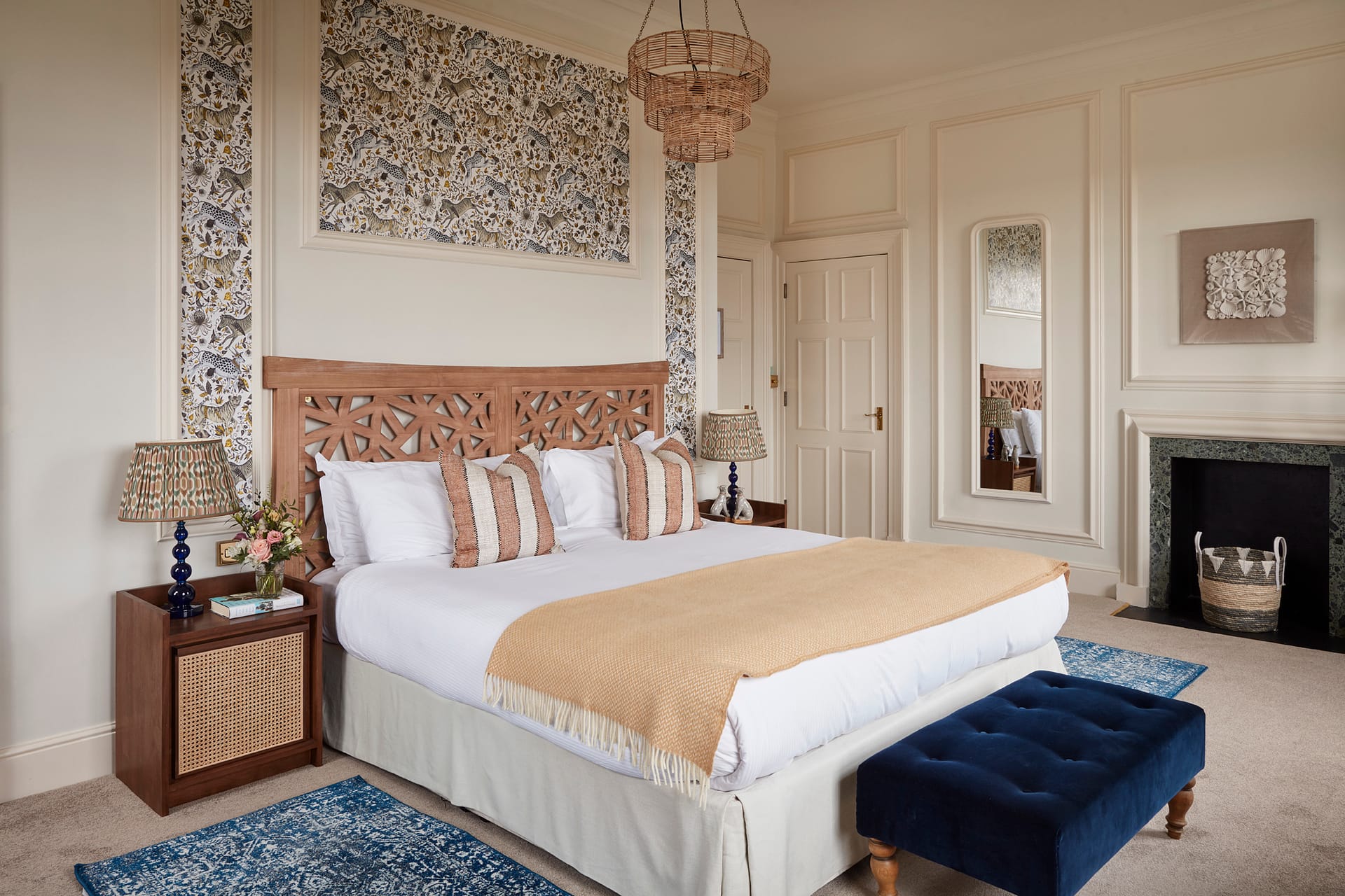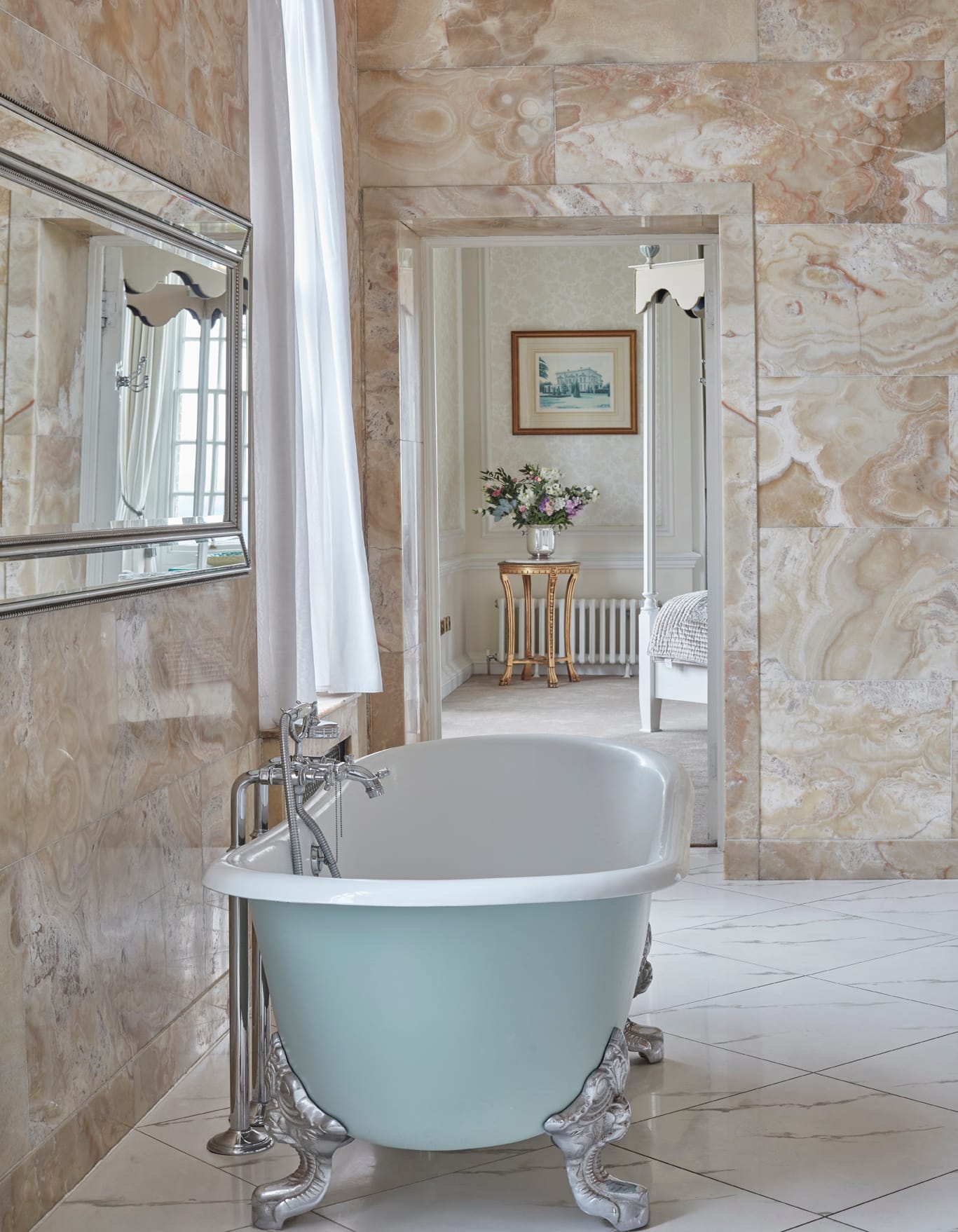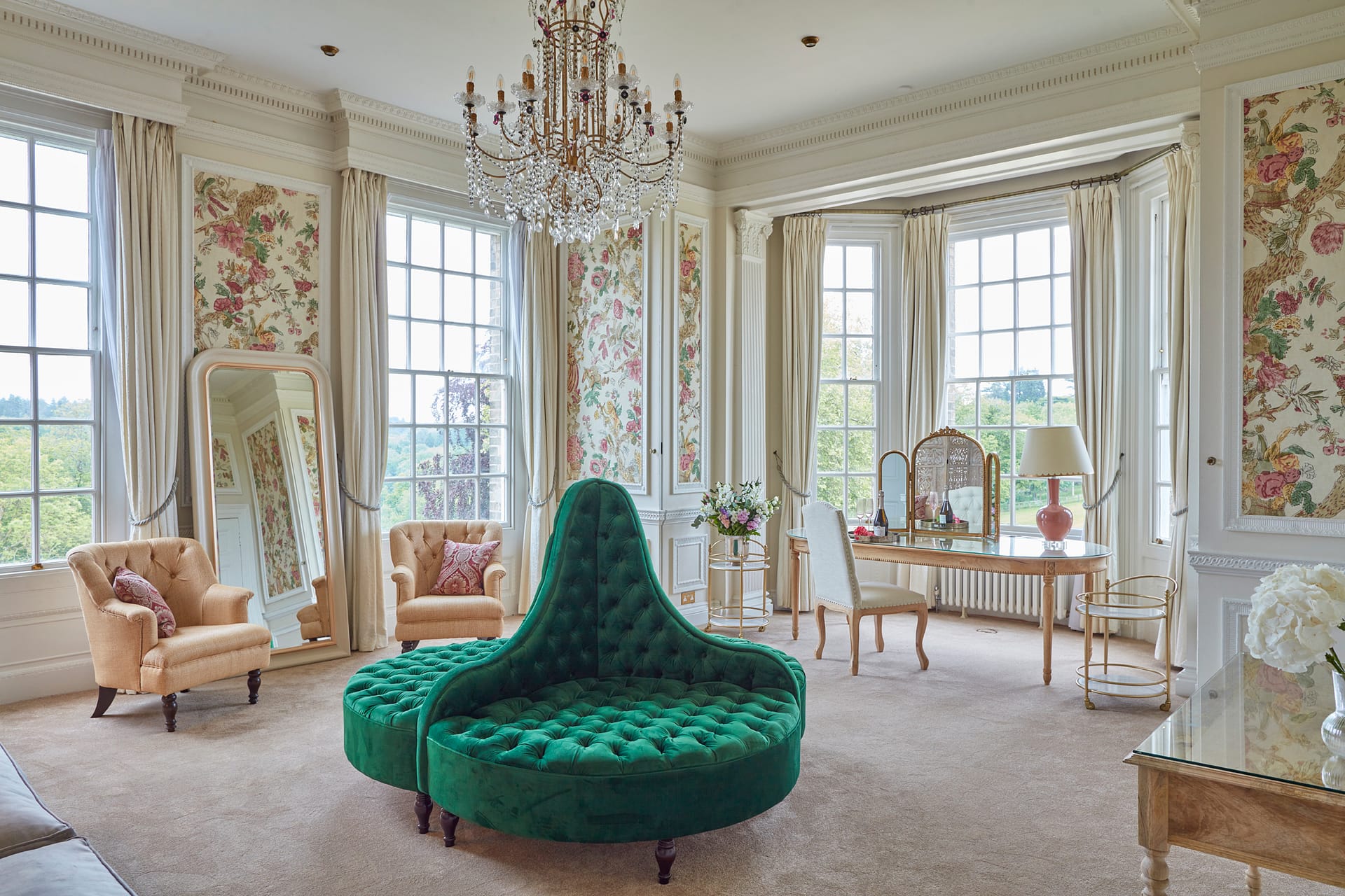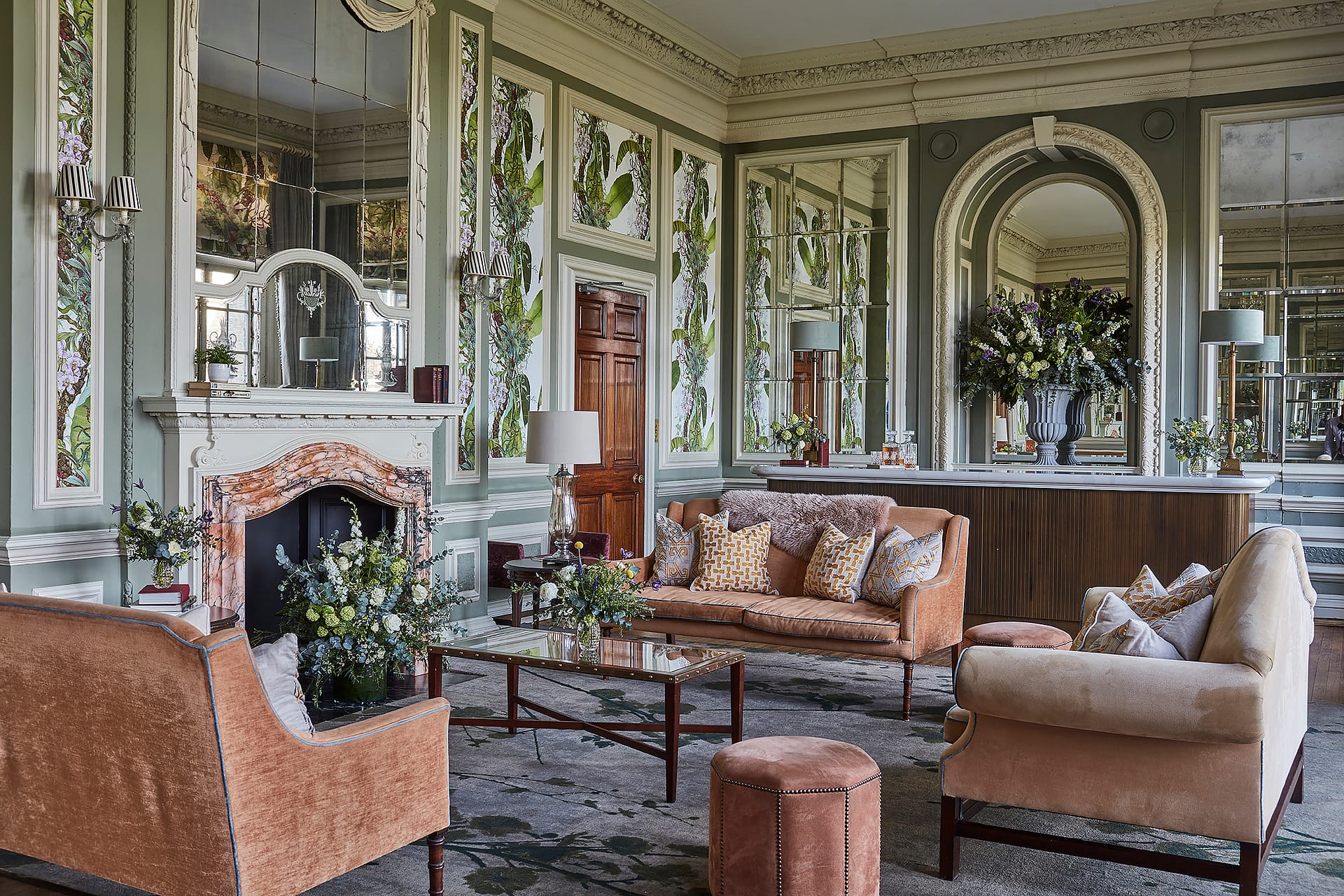 Elsewhere, the Wedding Suite (the largest in Europe, no less) is home to honeyed onyx, a clawfoot bath and soft natural light. The Drawing Room opens out onto the South Lawn for post-ceremony drinks. The Boudoir offers a smaller, calm space for intimate ceremonies or quiet moments. The Library becomes breakfast HQ the next morning. And the mirrored Willingdon Bar is where the evening begins — and often ends — in earnest (I really loved the vibe in here, and the patterned wallpaper!).