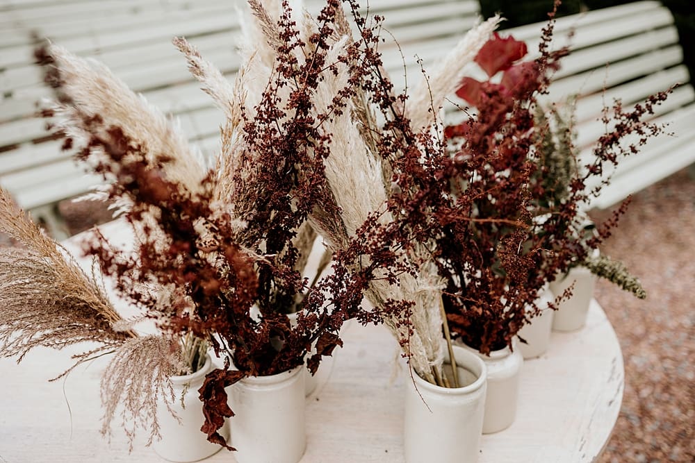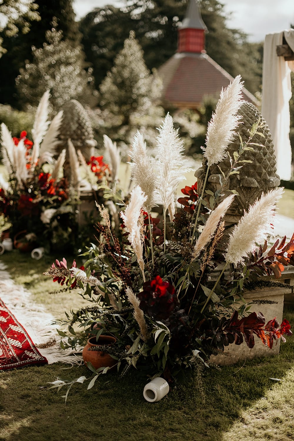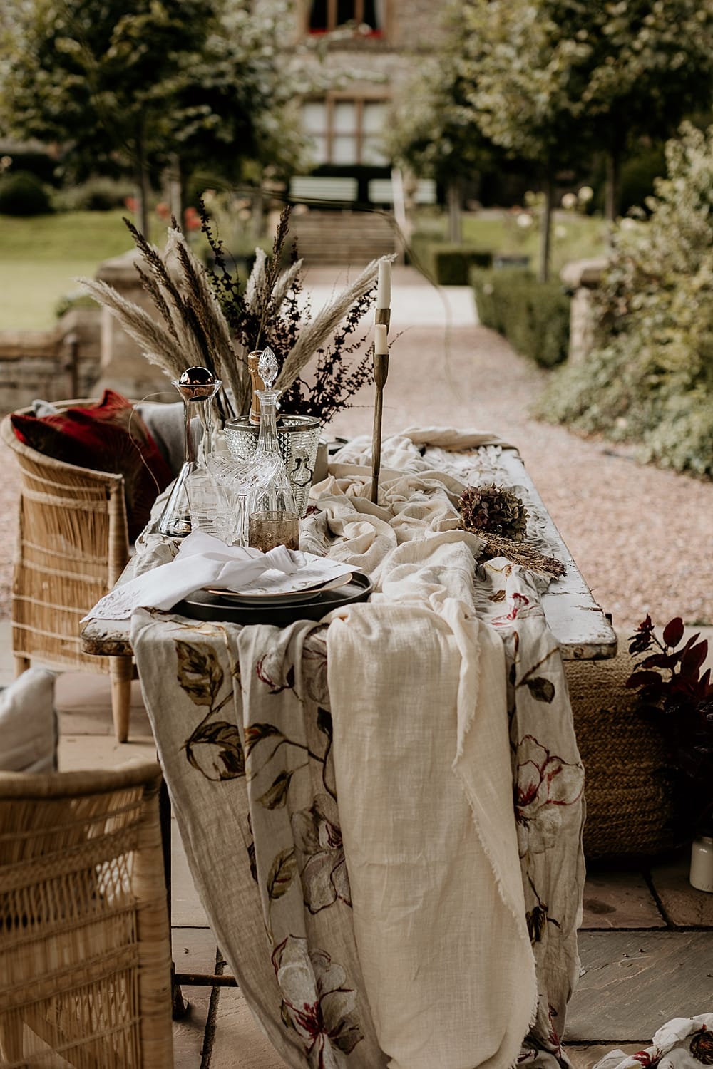 Sophie from Earth Gallery Flowers created beautiful flanking floral displays, with soft pampas grasses which stood out against the deep red foliage used. Dotted between the flowers, she used earthenware vases from Virginias Vintage to add texture and depth. These warm but minimalistic colours worked perfectly with the rest of the props, adding drama while being a simplistic style to suit events throughout the year.
