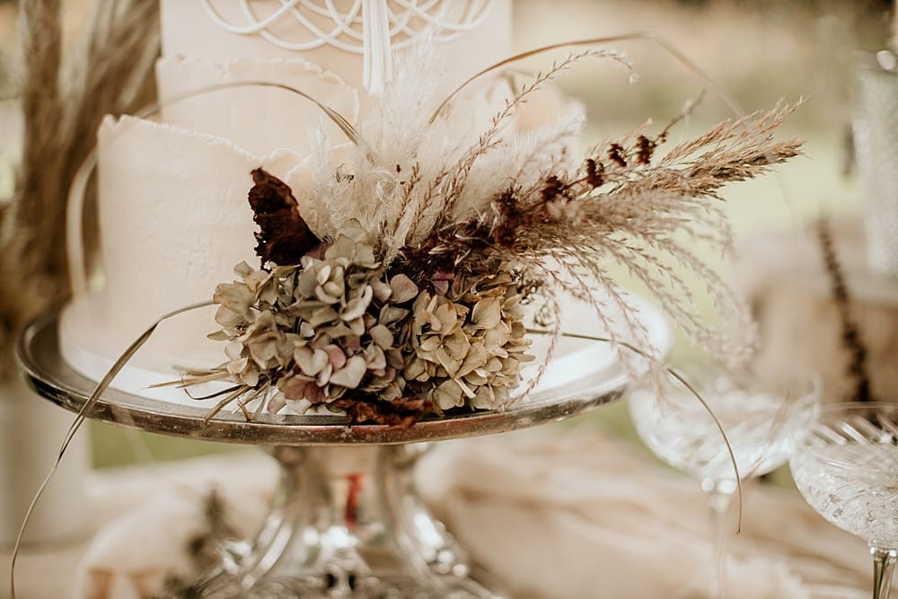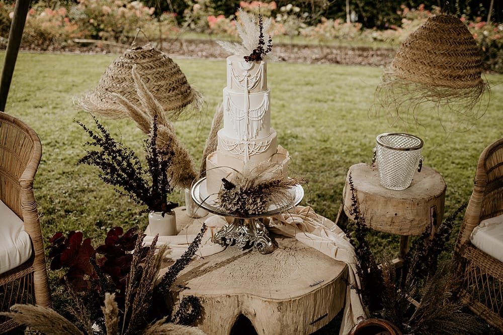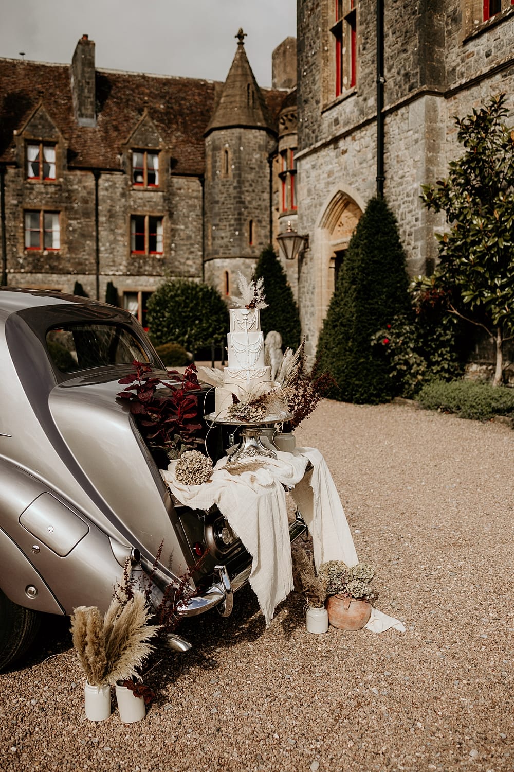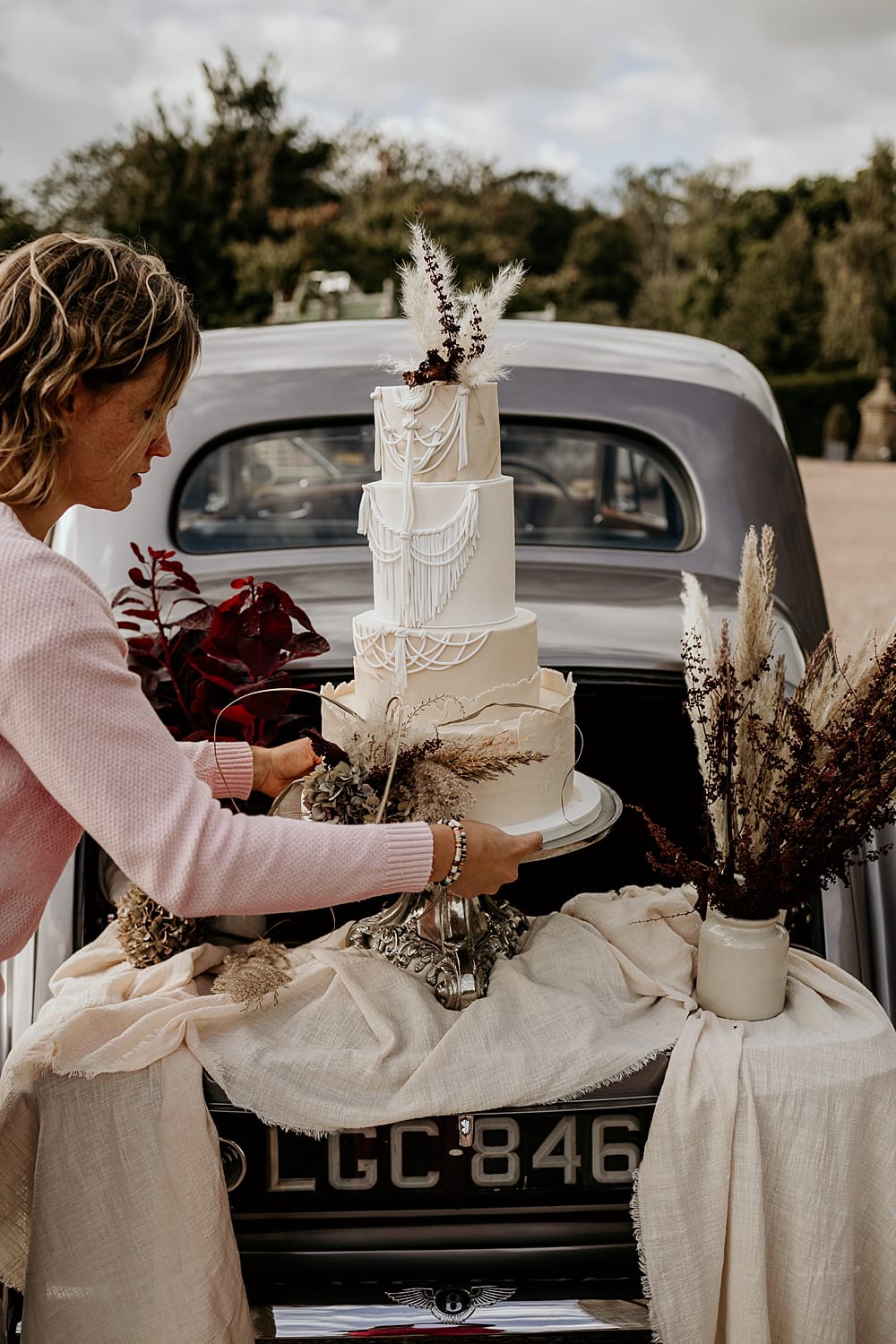 The cake was created by the talented Nicole from Sweet Satisfaction and it looked utterly stunning as it stood out against the gun mental grey of the car. In line with the boho styling, macrame design was hand applied to the 3-tier cake, along with subtle touches of peach tones to bring in the other elements of the shoot style. The small earthenware vases were re-purposed and the flowers were scaled down and simplified.