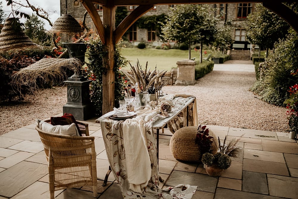 This is such a popular space for ceremonies in the Summer months, with its own dedicated seating space, star studded ceiling and glorious backdrop views of the house itself. We wanted to try and reimagine this space for an alternative use, demonstrating how decorations in this area can make a big impact.