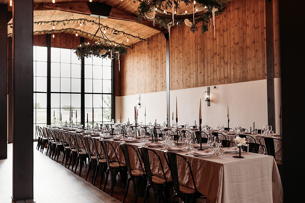 The Stable Barn – Originally the farm’s stables and home to Richard’s dad’s racehorses, Claire and Richard and transformed this space into the Stable Barn in 2017. A true architectural inspiration, boasting striking light installations, warm timber panelling and exceptional views across the paddocks through the floor to ceiling Crittal-style windows. The Stable Barn seats up to 156 guests for your wedding breakfast.